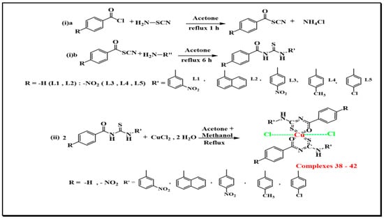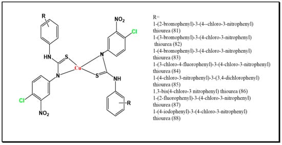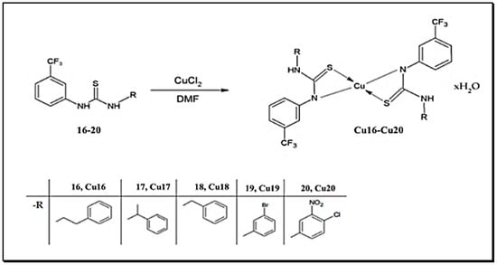 Five new Cu (II) complexes, Cu16–Cu20, with varied antimicrobial activities, were synthesized by Aleksandra et al. [18]. Five distinct ligands were produced and employed prior to complex formation. The particular groups of the ligands made of thiourea derivatives determine how copper complexes with them. Ligands 19 and 20 were halogen phenyl groups, and ligands 16–18 were alkylphenyl [19,20,21]. The method for synthesis is shown in Figure 5. The synthesized complexes were tested against a variety of bacterial and fungal strains, including S. aureus NCTC 4163, S. aureus ATCC 25923, S. aureus ATCC 6538, S. aureus ATCC 29213, S. epidermidis ATCC 12228, S. epidermidis ATCC 35984, E. coli NCTC 10538, E. coli ATCC 25922, P. aeruginosa ATCC 15442, P. aeruginosa ATCC 27853, C. albicans ATCC 10231, C. albicans ATCC 90028 and C. parapsilosis ATCC 22019. With an MIC value of 4 µg/mL, the most active compound, Cu20, demonstrated strong activity against Staphylococcus epidermidis (MRSE) and methicillin-resistant S. aureus (MRSA) 537, 585 and 586 strains. The other complexes, however, exhibited minimal activity and were ineffective against other fungal species and Gram-negative strains of E. coli.