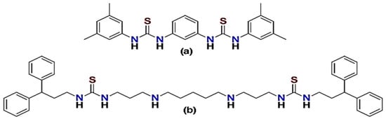 Compounds containing a bis-thiourea nucleus: (a) Phenyl-bis phenylthiourea; (b) Polyamine analog of alkylated bis-thiourea [60].