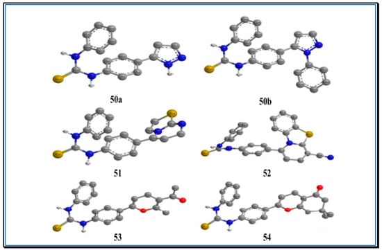 Synthesis of phenylthiourea pyrazole-based compounds 50a, 50b, thiazolopyramidine and thiazolopyridine compounds 51, 52 and phenylthiourea pyran-based compounds 53, 54 [73].