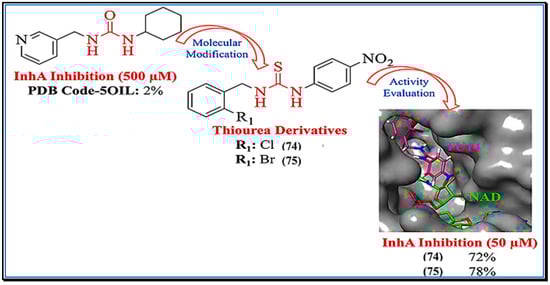 - Şengül, D.D.; Miyase, G.G.; Hilal, D.; Vagolu, S.K.; Christian, L.; Dharmarajan, S. Design and synthesis of thiourea-based derivatives as Mycobacterium tuberculosis growth and enoyl acyl carrier protein reductase (InhA) inhibitors. Eur. J. Med. Chem. 2020, 199, 112402. [Google Scholar]