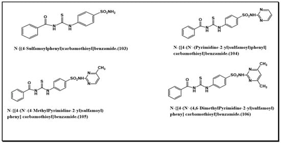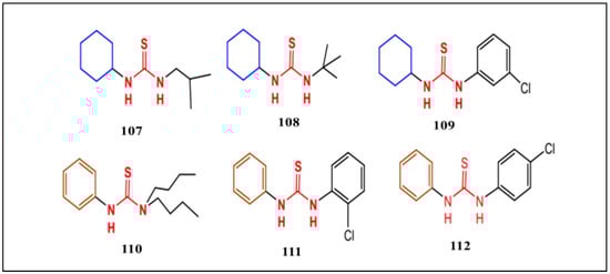 Thiourea has a wide range of uses in organic synthesis reactions as intermediates, making it an incredibly versatile compound [2]. Additionally, it is utilized in many commercial products such as photographic films, dyes, elastomers, plastics and textiles [3]. However, the most significant and effective application of thiourea is in the realm of biology, as illustrated in Figure 3. Research has demonstrated that it possesses numerous beneficial properties, including antibacterial, antioxidant, anticancer, anti-inflammatory, anti-Alzheimer, antitubercular and antimalarial effects [4,5,6,7,8,9]. Several previous reviews have focused on the pharmacological activities of thiourea derivatives [10,11,12]. Here, this review presents an overview of state-of-the-art biomolecules derived from thiourea as well as diverse medicinal applications in this field over the last five years.