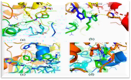 Three strains of bacteria “E. coli, S. aureus, and K. pneumoniae” were used to test each of the produced compounds, 5–15. As seen in Figure 4 [17], all compounds exhibited strong antibacterial activity when compared to the ligand. Comparable to the common antibiotic tetracycline, compounds 5 and 9 had strong efficacy against E. coli. The several binding modes with the essential amino acid residues of the bacterial tyrosinase enzyme’s active site are referred to as the antibacterial activity.
