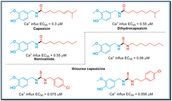 - Huang, X.F.; Xue, J.Y.; Jiang, A.Q.; Zhu, H.L. Capsaicin and its analogues: Structure-activity relationship study. Curr. Med. Chem. 2013, 20, 2661–2672. [Google Scholar] [CrossRef]