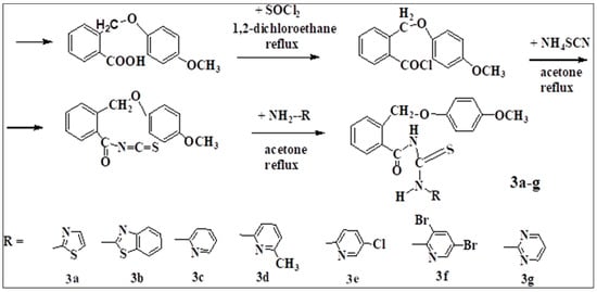A novel set of seven N-acyl thiourea derivatives, namely 3a–3g, were developed by Roxana et al. [14]. Their synthesis method employed the condensation of acid chloride and ammonium thiocyanate in an anhydrous acetone solution. The resulting isocyanate was then allowed to react with a heterocyclic amine, with the amine undergoing a nucleophilic addition to the isocyanate, as shown in Scheme 2.