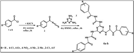 The synthesized compounds, 3a–3g, were subjected to testing against various bacterial strains, including S. aureus, E. faecalis, E. coli and P. aeruginosa. The positive control used was Ciprofloxacin (5 µg/mL). The findings demonstrated that the tested drugs’ MIC ranged from >5000 to 1250 µg/mL, which was considerably greater than the conventional antibiotic utilized. These compounds were found to be more potent than previously reported thiazole derivatives [14]. In addition, eight tris-thiourea derivatives, 4a–4h, with symmetrical structures, were synthesized using benzoyl chloride and potassium thiocyanate with melamine under reflux conditions through a condensation reaction. The synthesis pathway is depicted in Scheme 3 [15].
