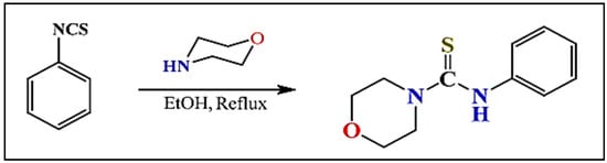 Thiourea derivatives are highly effective in metal complexes due to the presence of nitrogen atoms, as well as lone pairs on sulfur and oxygen atoms, which serve as ligating centers and coordinate with a wide range of metal centers to produce stable metal complexes [16]. Ahmed et al. synthesized novel 1-morpholinyl 3-phenyl thiourea ligands and their corresponding metal complexes with the aim of developing new antimicrobial agents. The ligand N-Phenylmorpholine-4-carbothioamide (HPMCT) was prepared according to the procedure outlined in Scheme 4 [17].