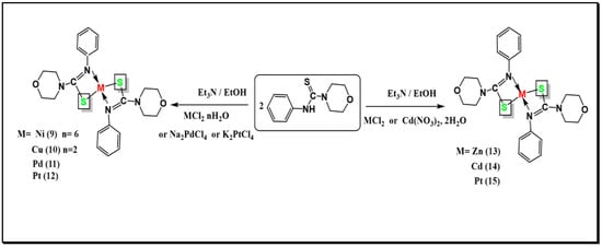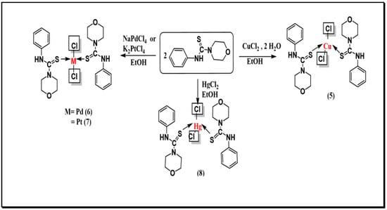 In complexes 5–8, the thiourea ligand coordinates through a sulfur atom as a monodentate, as demonstrated in Scheme 5 [17]. On the other hand, in complexes 9–15, the ligand coordinates with the central atom through N and S atoms as a bidentate, as shown in Scheme 6.