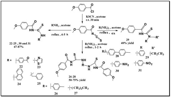 Ten novel thiourea derivatives, 22–31, were recently synthesized by reacting potassium thiocyanate with 4-methoxy benzoyl chloride using the nucleophilic addition–elimination mechanism to form an isothiocyanate derivative, as shown in Scheme 7 [24]. The final ten compounds were produced by reacting this derivative with various amines in accordance with the amine’s nucleophilic addition mechanism to the isothiocyanate. The DPPH radical scavenging activity method was used to describe these compounds and assess their antioxidant potential. Compounds 29, 27 and 24 demonstrated good antioxidant activity with IC50 values of 5.8, 42.3 and 45 μg/mL, respectively, when compared to normal ascorbic acid, which had an IC50 value of −33.22 μg/mL. The other drugs’ IC50 values varied between 89 and 245 μg/mL.