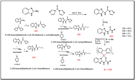 Also, Samuel et al. [38] conducted a thorough screening of several thiourea derivatives for toxicity in ovarian cancer cell lines, including those that showed cisplatin treatment resistance. Three molecules of luminescence iridium complexes based on a 2-aminobenzimidazole unit were produced by the researchers. Through a substoichiometric 2-aminobenzimidazole reaction in acetonitrile, 1,1′-thiocarbonyldiimidazole was monosubstituted efficiently. When compounds 32S–35S were purified, they had a 63–81% yield. This was due to a series of amines replacing the second imidazoyl unit in the presence of dimethylaminopyridine (DMAP) in dimethylformamide. Scheme 8 shows how iridium complexes based on these systems were subsequently created by reacting 33S with [Ir(ppy)2Cl]2 in toluene with potassium carbonate present. The result was bright yellow powders, or Ir-33S, in a 53% yield.