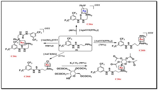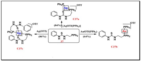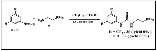 Because silver complexes are less toxic, they are useful in the therapy of cancer. Their principal mode of action is binding to proteins that contain thiols and DNA [53]. Through a 1:1 reaction between the respective isothiocyanate a and b and 2-(diphenylphosphino) ethylamine (c), Guillermo et al. synthesized metal complex thioureas 36 and 37. Thioureas 36 (80% yield) and 37 (85% yield) were synthesized as shown in Scheme 9 [52].