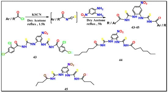Nasima et al. [60], synthesized three bis-thiourea derivatives using the method outlined in Scheme 13. Before adding 4-nitrobenzene-1,2-diamine, they introduced KSCN in acetone to convert appropriately substituted acid chlorides to corresponding acyl isothiocyanates. Acyl thioureas were obtained by recrystallizing the resultant products from ethanol, with a yield that varied between 73% and 89%.