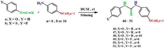 It is crucial to adjust the balance between the produced compounds’ lipophilicity and hydrophilicity in order to look into the inhibitory mechanisms of the compounds. To enhance permeability through lipophilic cellular membranes, a lengthy non-polar alkyl terminal chain containing six to sixteen carbon atoms must be included in the synthesis of novel diaryl thiourea derivatives. Moreover, adding a fluorine group as a hydrogen bond acceptor group can increase the proposed compounds’ aqueous solubility [61]. By combining phenolisocyanate or 4-fluorophenyl isothiocyanate with alkoxy anilines (4-hexyloxyaniline, 4-octyloxyaniline or 4-hexadecyloxyaniline) in dichloromethane at an ambient temperature, Mohamed et al. produced N, Nl disubstituted thiourea derivatives 46–51. Scheme 14 [64] shows the equimolar amounts used in this reaction that was conducted.