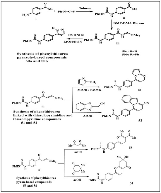 The thiazole, pyrazole and pyran moieties found in several thiourea derivatives have also been shown to have promising anticancer action [68]. Certain physicochemical and structural characteristics that impact thiourea’s pharmacological properties are conferred by the integration of these heterocyclic moieties [69,70,71]. Their therapeutic potential is increased by their interaction with molecular targets, which modify cellular activities and signaling cascades [72]. Figure 10 [73] illustrates the series of thiourea derivatives that Ahmed et al. synthesized that contain heterocyclic moieties. 4-Aminoacetophenone (i) was refluxed with phenyl isothiocyanate in dry toluene to form the pyrazole-based derivative 1-(4-acetylphenyl)-3-phenylthiourea (ii). This was then refluxed with the reagent, dimethylformamide-dimethyl acetal (DMF-DMA), in dioxane to convert it into its corresponding enaminone (iii). Compound iii reacted with two distinct nitrogen binucleophiles (phenyl hydrazine and hydrazine hydrate) via refluxing in ethanol and triethylamine, yielding compounds 50a and 50b, which are phenyl thiourea pyrazoles. Compound (iii) was used to create compound 51, thiazolopyrimidine-phenylthiourea, by reacting with 2-aminothiazole in boiling methanol and sodium methoxide to create thiazole derivatives. The equivalent benzothiazolo [3,2-a] pyridine-phenylthiourea compound 52 was produced by compound iii reacting with benzothiazole-2-yl acetonitrile while under refluxing acetic acid. In glacial acetic acid, compound iii reacted with acetylacetone to yield the corresponding 1-(4-(5-acetyl-6-methyl-4H-pyran-2-yl) phenyl)-3-phenylthiourea-based pyran compound 53, whereas compound iii reacted with dimedone to yield tetrahydrochromenephenylthiourea, compound 54. Scheme 15 shows the pathway of synthesis.