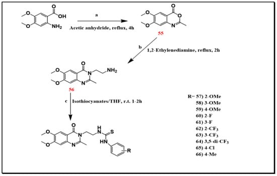 As shown in Scheme 16 [81], Ashish et al. prepared a number of novel 2-methylquinazolin-4(3H)-one derivatives carrying thiourea. Compound 55 is the precursor of 6,7-dimethoxy-2-methyl-4H-benzo[d][1,3]oxazin-4-one. Compound 55 was reacted with 1,2-ethylenediamine at reflux for two hours to yield compound 56, 3-(2-aminoethyl)-6,7-dimethoxy-2-methylquinazolin-4(3H)-one. Then, at an ambient temperature, compound 56 was reacted with the suitable arylisothiocyanates to create the required thiourea derivatives, 57–66. Every synthesized compound was tested for its inhibitory effect on IL-6 and TNF-α at a concentration of 10 µg/mL. Compared to the conventional dexamethasone (1 µg/mL), compounds 60 and 62 showed stronger inhibitory efficacy against TNF-α (78% and 72%) and IL-6 (89% and 83%). Conversely, compounds 57 and 64 showed modest levels of IL-6 (67% and 62%) and TNF-α (52% and 50%). Little to no inhibitory activity was demonstrated by the remaining compounds.