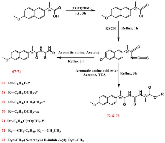 New thiourea derivatives of naproxen, including aromatic amines and aromatic amino acid esters, were produced by Nikola et al. [87]. The synthesis process was followed as illustrated in Scheme 17. To create a modified naproxen scaffold, they started with S-naproxen. When aromatic amines were present, naproxenoyl chloride, which was created when naproxen and oxalyl chloride combined, could react with potassium thiocyanate to form compounds 67–71 or with esters of aromatic amino acids to form compounds 72 and 73.