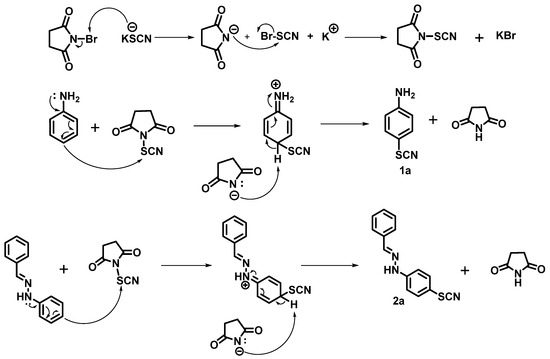 Several methods have been tried for the synthesis of thiocyanatoaniline. Reaction with ammonium thiocyanate, trichloroisocyanuric acid, and wet SiO2 yielded the product by in situ generation of hypochlorous acid in a heterogeneous system and subsequent oxidation of the thiocyanate anion in dichloromethane solvent [30]. Among the other oxidants employed with ammonium thiocyanate, cerium (IV) ammonium nitrate in methanol afforded unsatisfactory yield of the product [31]. A significant improvement could be observed when the reaction was performed with iodine [32]. Sodium perborate also facilitates the transformation but under acidic conditions employing glacial acetic acid [33]. A free radical process for the transformation could be invoked using oxone in a methanol medium [34] or manganese acetate in acetic acid [35] with modest yields. The conversion was also achieved using diethyl azodicarboxylate in an acetonitrile medium [36]. A milder condition was attempted using anhydrous ferric chloride in dichloromethane but took a longer time to achieve an appreciable yield [37]. Microwave irradiation was explored on a solid surface by employing acidic alumina [38]. DDQ mediation thiocyanation of the substrates depends on the electron donor ability of the aromatic nucleus [39]. Attempts to obtain the product with iodine pentoxide were not encouraging [40]. Thiocyanation in iodic acid afforded good yields, but chloroform was used as the solvent [41]. With hydrogen peroxide or periodic acid, the reaction was performed in aqueous medium [42]. Dichloroidodo benzene promotes the reaction at 0 °C in a dichloromethane medium [43]. Despite these advancements, the methods employed have one or more limitations, such as poor yield, narrow substrate scope, halogenated or toxic solvent, need for an excessive amount of strong oxidizing reagent, acidic conditions, heterogeneous reaction phase, poor performance, anhydrous medium, long reaction time, inert atmosphere, and stringent reaction conditions with difficultly in scalability. Therefore, there is an unmet need to develop an efficient process for synthesizing thiocyanate derivatives of anilines. A simple procedure for thiocyanation was demonstrated on arene substrates using N-thiocyanatosuccinimide (NTS) [44]. However, the scope of this strategy was not widely explored for aniline derivatives and 1-(substituted benzylidene)-2-phenylhydrazines. We, therefore, decided to investigate the electrophilic thiocyanation reactions of these substrates under eco-friendly conditions by using N-bromosuccinimide and potassium thiocyanate in an ethanol medium.