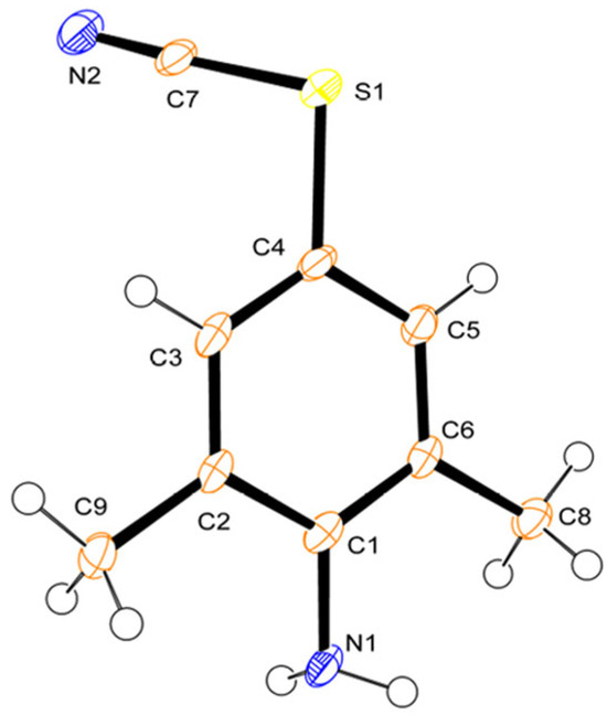 2-methyl-4-thiocyanatoaniline (1c) [42]: Creamy white solid; Yield 96%; m.p. = 68–70 °C; IR (νmax, cm−1): 3449.59, 3368.62, 3246.89, 2924.89, 2150.60, 1628.89, 1592.12, 1568.60, 1491.02, 1454.53, 1402.63, 1296.51, 1153.92, 1091.96, 1032.18, 995.58, 885.14, 814.70, 719.01; 1H NMR (400 MHz, CDCl3) δ ppm: 7.24–7.26 (m, 1H, Ar), 7.20–7.23 (m, 1H, Ar), 6.59–6.68 (m, 1H, Ar), 3.90 (s, 2H, NH2), 2.13 (s, 3H, CH3); 13C NMR (100 MHz, CDCl3) δ ppm: 147.2, 135.1, 132.2, 124.0, 115.8, 112.7, 109.3, 17.3; HRMS (ESI): m/z calcd. for C8H8N2S [M + H]+: 165.0408; found: 165.0509.