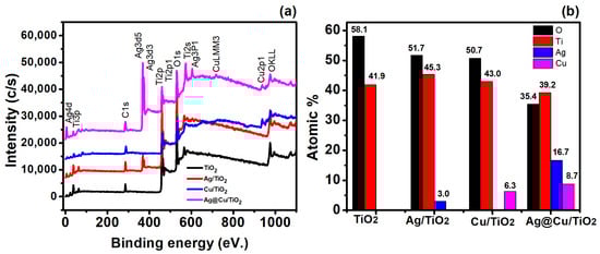 The elemental composition and functional groups of the prepared catalysts (pure TiO2, Ag/TiO2, Cu/TiO2, and Ag@Cu/TiO2) were studied by X-ray photoelectron spectroscopy (XPS). The survey spectra (Figure 5a) provided insights into the surface elements, while the detected composition is illustrated in Figure 5b. The pure TiO2 demonstrated a composition comprising 58.1% oxygen and 41.9% titanium. In the case of the Ag/TiO2, the elements were present in the percentages of 51.7% oxygen, 45.3% titanium, and 3.0% silver. Similarly, the incorporation of copper into the Cu/TiO2 was confirmed, with a composition of 50.7% oxygen, 43.0% titanium, and 6.3% copper. The ternary nanocomposite, referred to as Ag@Cu/TiO2, exhibited an elemental composition of 35.4% oxygen, 39.2% titanium, 16.7% silver, and 8.7% copper.