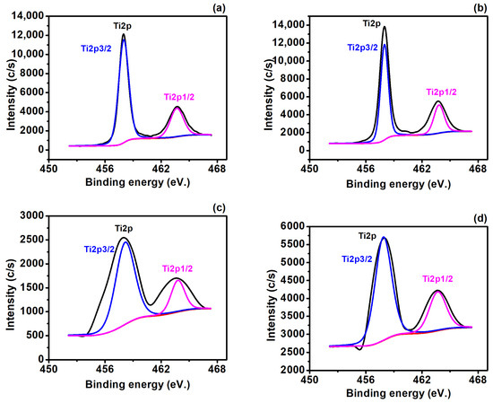 The chemical state analysis of the Ti2p was further explored to elucidate the chemical interactions in the TiO2, Ag/TiO2, Cu/TiO2, and Ag@Cu/TiO2 (Figure 6a–d). In the chemical state analysis of the pure TiO2 (Figure 6a), distinct peaks at 457.99 eV and 463.67 eV were observed, corresponding to Ti2p3/2 and Ti2p1/2, with contributions of 73.32% and 26.68%, respectively. The introduction of Ag and Cu into the TiO2 resulted in alterations in the contributions of Ti2p3/2 and Ti2p1/2. Specifically, the Ag/TiO2 sample exhibited total contributions of 72.05% (Ti2p3/2) and 27.95% (Ti2p1/2). Similarly, the Cu/TiO2 showed total contributions of 78.38% (Ti2p3/2) and 21.62% (Ti2p1/2). The final ternary composite, Ag@Cu/TiO2, displayed total contributions of 72.31% (Ti2p3/2) and 27.69% (Ti2p1/2). In summary, the observed changes in the atomic percentage contributions of Ti2p3/2 and Ti2p1/2 in the pure TiO2 following the addition of Ag and Cu signify the successful interaction between the components.
