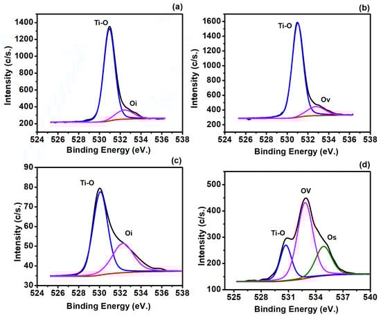 The O1s spectra of the pure TiO2 (Figure 7a) exhibit two main peaks at around 530 eV and 532.5 eV, attributed to the interaction between oxygen and Ti at 530 eV and oxygen vacancy at 532.5 eV, respectively [1]. Notably, the presence of Ag in the TiO2 (Ag/TiO2), as depicted in Figure 7b, results in an increase in the oxygen vacancy from 12.54% to 13.12%. This trend continues with the addition of Cu to the TiO2 (Cu/TiO2) and the ternary Ag@Cu/TiO2. The maximum oxygen vacancy, reaching 56.45%, is observed for the Ag@Cu/TiO2. These vacancies serve as active capture sites for dye molecules and pollutants, thereby enhancing the photocatalytic activity of the material [2]. These findings align with our photocatalytic results, as described later in Figure 9. Additionally, an extra peak is evident at around 534.6 eV for the Ag@Cu/TiO2, attributed to the surface oxygen (Os), further contributing to the enhanced photocatalytic activity of the ternary Ag@Cu/TiO2 compared to the pure TiO2, Ag/TiO2, and Cu/TiO2.