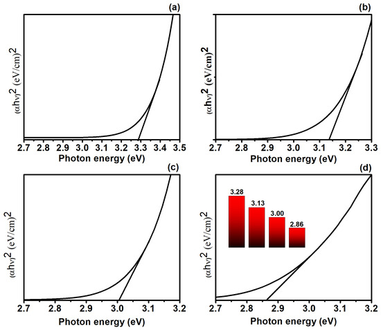 The band gap alteration significantly influences the charge carriers’ migration, directly effecting the photocatalytic efficiency of the catalyst. Therefore, the band gap calculations for the TiO2, Ag/TiO2, Cu/TiO2, and Ag@Cu/TiO2 (Figure 9a–d) were determined using the Tauc plot relations [26].