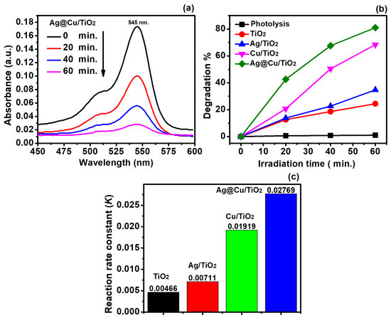 The time-dependent UV–Vis spectrum of RB under UV–Vis irradiation is depicted in Figure 9a, where the characteristic absorption peak is at λmax of 545 nm, which is the primary feature of RB. Observing Figure 9a, it becomes evident that with the increase in the irradiation time from 0 to 60 m, the absorption peak gradually diminishes, indicating the degradation of RB by the TiO2, Ag/TiO2, Cu/TiO2, and Ag@Cu/TiO2 under visible light.