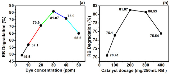 (a) Effect of the RB concentration at 5 ppm, 20 ppm, 30 ppm, 40 ppm, and 50 ppm while keeping the dosage of the Ag@Cu/TiO2 fixed at 200 mg/250 mL and the light intensity at a 500 W halogen lamp. (b) Variation in the dosages of the Ag@Cu/TiO2 at 50 mg/250 mL, 100 mg/250 mL, 200 mg/250 mL, 300 mg/250 mL, and 400 mg/250 mL.