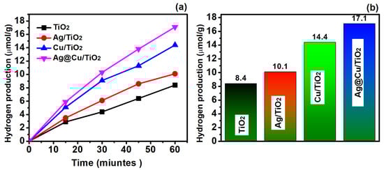 (a,b) Hydrogen production rate of the TiO2, Ag/TiO2, Cu/TiO2, and Ag@Cu/TiO2 with a 20% concentration of methanol as a scavenger.