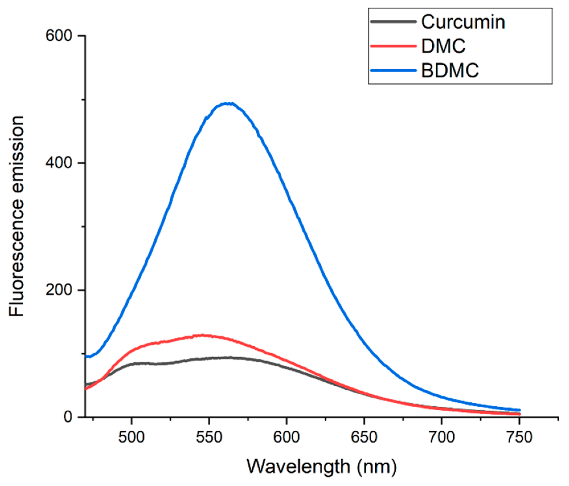 Fluorescence emission spectra for the three curcuminoids are shown in Figure 3. Emissions in the broad range of 490–650 nm were observed for CUR and DMC, while BDMC showed a potent emission at 560 nm that was five times more intense than that of the other two curcuminoids.