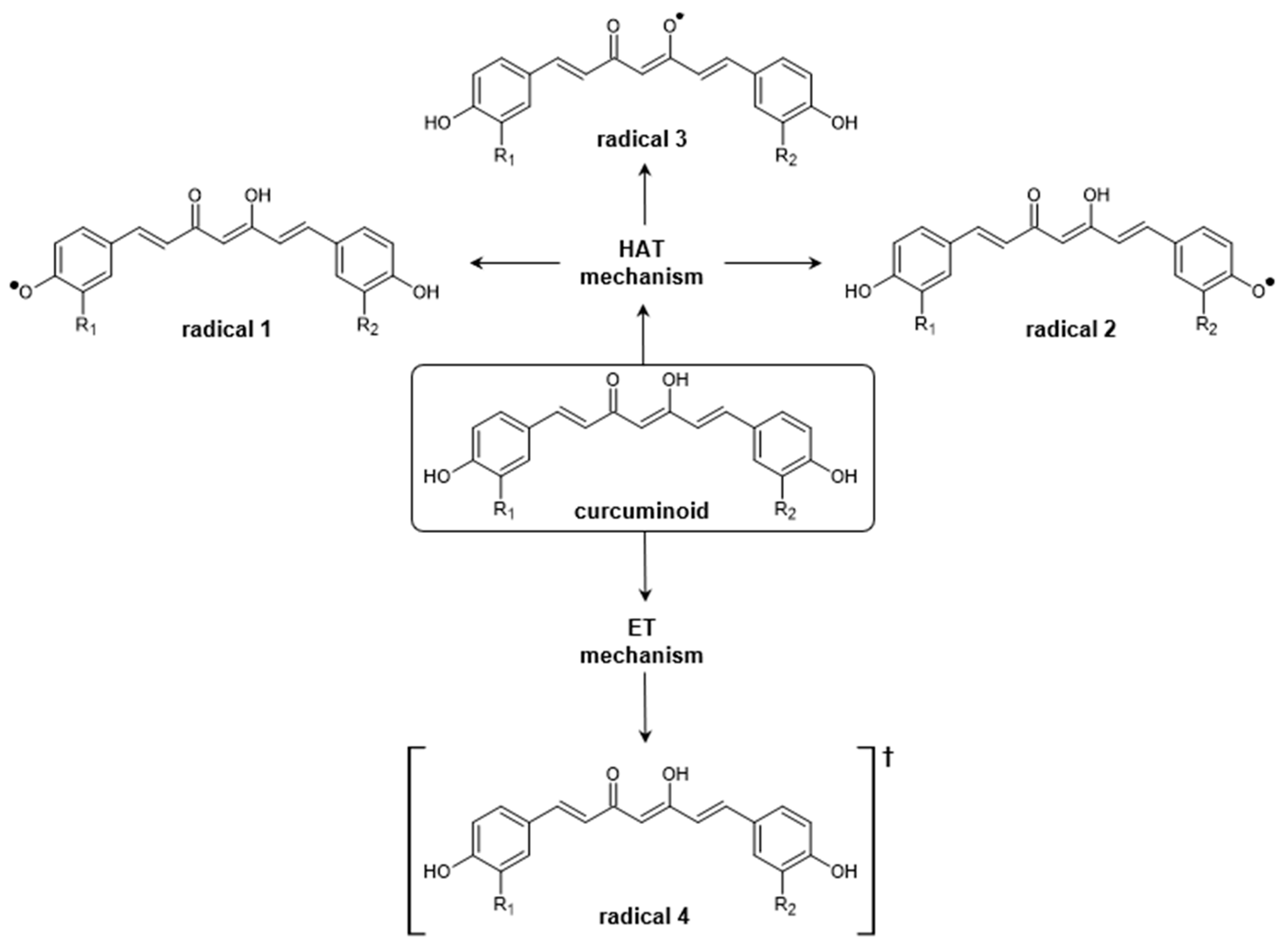Diagram summarizing the H-atom transfer (HAT) and one-electron transfer (ET) mechanisms for curcuminoids. In the HAT mechanism, there is the possibility of formation of radicals 1, 2, and 3, while in the ET mechanism, only radical 4 is formed.