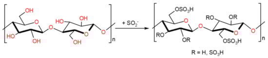 Sulfation is the nucleophilic replacement of hydroxyl groups of polysaccharides with sulfate groups and the production of their esters (Figure 1). Many methods have been developed for the synthesis of polysaccharide sulfates [41]. But most of them involve the use of toxic and dangerous reagents, which leads to complications in the technological process, premature corrosion of equipment and severe destruction of the original polymer. The efficiency of sulfation is influenced by the nature of the polysaccharide, the composition of its monomers and the configuration of glycosidic bonds, molecular weight and other structural factors. Even for the same polysaccharide, the reaction results depend on the sulfating agent, the ratio of components, the medium, the time and the temperature of the reaction [42].