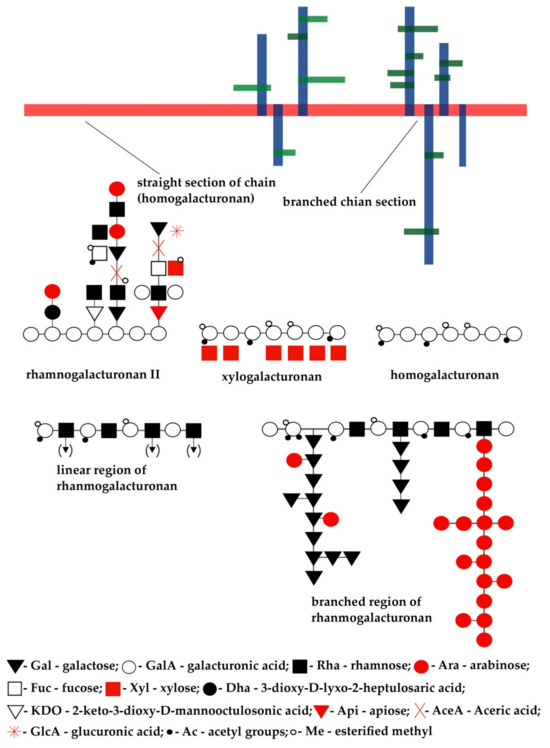 - Caffall, K.H.; Mohnen, D. The structure, function, and biosynthesis of plant cell wall pectic polysaccharides. Carbohydr. Res. 2009, 344, 1879–1900. [Google Scholar] [CrossRef]
