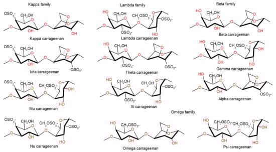 - Jiang, J.-L.; Zhang, W.-Z.; Ni, W.-X.; Shao, J.-W. Insight on structure-property relationships of carrageenan from marine red algal: A review. Carbohydr. Polym. 2021, 257, 117642. [Google Scholar] [CrossRef]