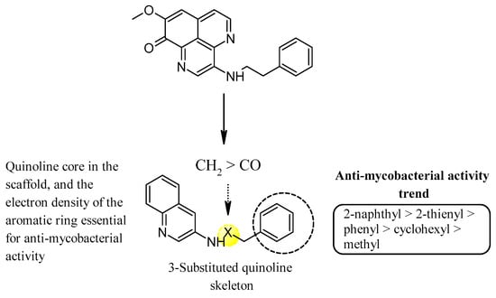 Mukomura et al. have synthesized several quinolone derivatives of aaptamine and observed that 3-(phenethylamino)demethyl(oxy)aaptamine compound 5 showed potential to develop potential anti-mycobacterial agents (Figure 4) (Table 2) []. The structure activity relationship (SAR) study indicates that the quinoline ring and the π-electron density over the aromatic ring is essential for anti-mycobacterial potential. Anti-mycobacterial activity trends were observed in the sequence of 2-naphthyl > 2-thienyl > phenyl > cyclohexyl > methyl. In brief, the N-(2-arylethyl) quinolin-3-amine moiety showed a promising framework for anti-mycobacterial candidates (Figure 5).