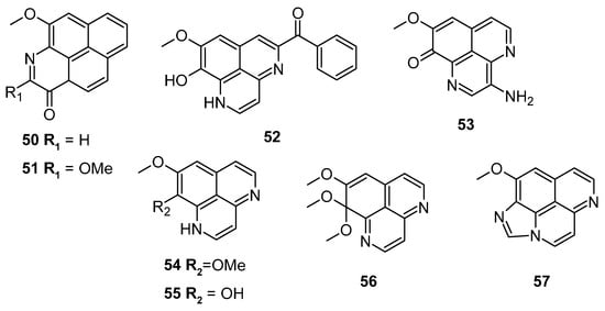 Pham et al. screened several aaptamine derivatives (Figure 10) over the L5178Y cell line (murine lymphoma). Compound 55 exhibited a notable cytotoxic potential with an IC50: 0.9 μM, compared to the reference kahalalide F (IC50: 4.3 μM). Compound 52 showed comparable efficacy with an IC50 of 5.5 μM (Table 4) [].