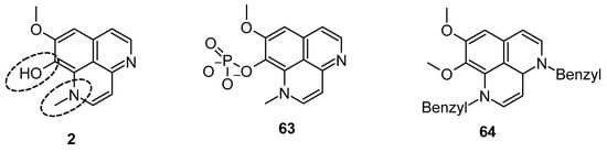 Pettit et al. reported the synthetic transformation of aaptamine to isoaaptamine (2), 9-demethylaaptamine (63), and 4-methylaaptamine (64) and their anticancer and antibacterial activity (Figure 13). The SAR study indicated that presence of the C-9 methoxy group and N-1 methylation are essential for their anticancer and antibacterial activity. Again, Pettit et al. reported that isoaaptamine (2) showed better anticancer activity than aaptamine and demethyloxy aaptamine. The instability of the potential isoaaptamine can be improved with a conversion to the phosphate prodrug hystatin 1 (63), but the anticancer and antimicrobial activity profile of hystatin 1 (63) was inferior to the parent compound. The insertion of a bulky group at the N-1 and N-4 position improved activity. 4-methylaaptamine (64) inhibited growth in the S phase of cell cycle [].