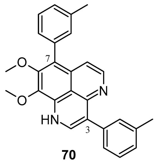 In 2020, Yang et al. synthesized numerous derivatives of aaptamine by introducing aromatic rings at the 3- and 7-positions; compound 70 (Figure 15) exhibited notable anti-proliferative activity against the extranodal natural killer/T-cell lymphoma cell line SNK-6 (IC50: 0.6 μM). Furthermore, compound 70 demonstrated cytotoxic effects on various lymphoma cell lines, such as Ramos, Raji, WSU-DLCL2, and SU-DHL-4 cells []. Shen et al. synthesized various 9-O-acylisoaaptamine and 4-N-acyl-dihydroaaptamine derivatives, which were then assessed for their anti-tumor activity against murine P-388 cells and various human tumor cell lines such as KB16, A549, and HT-29. All compounds exhibited a greater sensitivity towards P-388 cells []. Shubina et al. (2010) found that 2,3-dihydro-2,3-dioxoaaptamine, 6-(N-morpholinyl)-4,5-dihydro-5-oxo-demethyl(oxy) aaptamine, and 3-(methylamino) dimethyl (oxy) aaptamine have the potential to trigger apoptosis in THP-1 cells (human leukemia) [].
