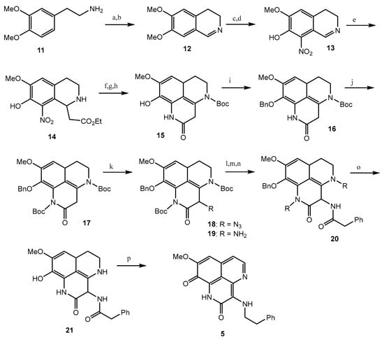 Total synthesis of 3-(Phenethylamino)demethyl(oxy)aaptamine. Reagents and conditions: (a) HCO2H, 175 °C; (b) POCl3, toluene, 95 °C; (c) 48% HBr, 95 °C, 46% (3 steps); (d) 40% HNO3, NaNO2, EtOH, −15 °C to 0 °C, 59%; (e) monoethyl malonate, reflux, 89%; (f) H2, Pd-C, AcOH, 71%; (g) Boc2O, CHCl3, reflux; (h) NaOMe, MeOH-CH2Cl2, 88% (2 steps); (i) BnBr, K2CO3; (j) Boc2O, Et3N, DMAP, CHCl3, reflux, (89%); (k) KHMDS, trisylazide, −78 °C, then AcOH, 0 °C, 70%; (l) Zn, NH4HCO2, CH2Cl2-MeOH; (m) PhCH2COCl, pyridine; (n) TFA, CH2Cl2, 46% (3 steps); (o) H2, Pd-C, THF-MeOH, 80%; (p) (i) BH3·THF, THF, 45 °C, (ii) 5% HCl, THF; (iii) O2, 20% TFA, 85 °C, 45%.