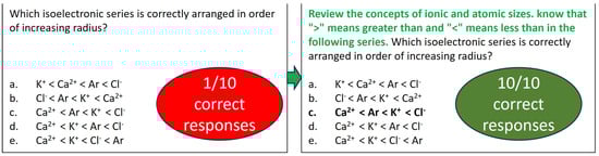 One of the strategies in crafting prompts involves presenting context or relevant information before posing questions to ChatGPT-3.5, especially in specialized subjects. Since ChatGPT is trained on an extensive dataset, providing appropriate cues should guide it in utilizing the patterns and associations learned from its training phase to generate accurate responses. Moreover, clearly defining symbols employed within the prompt also prevents misinterpretations. A question with a success rate of 1 out of 10 trials, corresponding to the “apply” level of Bloom’s taxonomy, was selected to illustrate this point (Figure 1). The original prompt, “Which isoelectronic series is correctly arranged in order of increasing radius?”, lacked specific guidance and did not explicitly direct ChatGPT-3.5 to consider the concepts of ionic and atomic sizes before generating a response. Additionally, the prompt does not clarify the meanings of the “>” and “<” symbols, potentially leaving ChatGPT-3.5 to rely on its existing understanding and increasing the likelihood of errors. As seen from the iterations (see Table S3 in Supplementary Materials), ChatGPT-3.5 gave a correct explanation but chose the incorrect order.
