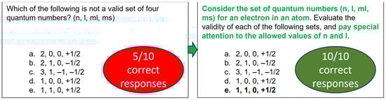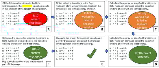 Iterative prompt design is a loop-based approach that involves continuously refining AI prompts to achieve the desired outcomes. This process involves creating an initial prompt, evaluating its output, adjusting the initial prompt based on the analysis, running the modified prompt, examining the results, and refining the prompt until the desired results are achieved [46]. To illustrate this strategy, a low-accuracy question (three correct responses over ten trials) requiring ChatGPT-3.5 to identify the lowest-energy photon emitted in hydrogen atom transitions was selected (see Figure 9A and Table S17 in Supplementary Materials). The initial prompt can be classified as a borderline case between the “understand” and “apply” levels of Bloom’s taxonomy, and it was structured as a multiple-choice, fill-in-the-blank question. Such borderline queries may require prior knowledge and a grasp of concepts but may not explicitly require application to novel scenarios. In these scenarios, students typically show a preference for leveraging their pre-existing knowledge base (“understand”) rather than treating the situation as entirely new (“apply”). They may utilize their understanding of Bohr’s equation and algebra to deduce that wider energy gaps predict higher-energy photons, guiding their attention toward smaller differences. Similarly, familiarity with fractions could lead them to infer that n = 6-to-n = 3 transitions emit low-energy photons, even though transitions like n = 5 to n = 2 or n = 4 to n = 1 appear similar, ultimately leading them to the correct answer through these intuitive leaps. Alternatively, students could meticulously calculate the energy for each transition using Bohr’s equation, applying their knowledge more directly but with increased time investment.