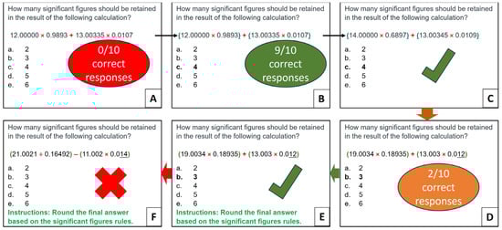Interestingly, a similar fix involving formatting the prompt worked for a question about significant figures in a multistep calculation. In ten successive attempts using the original unformatted prompt (Figure 4A), ChatGPT-3.5 consistently generated incorrect responses, revealing an interesting pattern of favoring the choice with three significant figures (see Table S6 in Supplementary Materials). This indicates that ChatGPT-3.5 recognized the concept of maintaining a minimal number of significant figures in a calculation but needed help to apply it. A closer examination of the prompt shows that the format of the mathematical expression lacks instructions regarding the order of operations [40]. Since solving algebraic expressions requires adhering to a specific sequence, such as PEMDAS, the AI could have been misled without such guidelines. Adding parentheses to the expression helped ChatGPT-3.5 to follow the rules of operation, boosting its accuracy to nine correct answers over ten trials (Figure 4B). Applying a similar technique worked successfully for a different set of numbers while preserving the same number of significant figures (Figure 4C). However, the accuracy dropped to 2 correct answers over 10 trials when ChatGPT-3.5 was provided with a similar problem but with different numbers and significant figures (Figure 4D). The analysis of the responses revealed the model’s inability to apply rounding rules consistently (see Table S7 in Supplementary Materials). Thus, providing specific instructions such as “Round the final answer based on significant figures rules” dramatically improved its performance, achieving correct responses over all ten trials (see Figure 4E and Table S8 in Supplementary Materials). These findings emphasize the importance of tailoring the prompts to the specific nuances of different disciplines. Even seemingly trivial details like parentheses can substantially impact the accuracy of AI responses. Interestingly, changing the mathematical operations while maintaining the numbers caused ChatGPT-3.5 to revert to its erratic behavior (Figure 4F). As a result, the model may require further refinement for its general use in calculating significant figures. This also agrees with previous studies demonstrating ChatGPT-3.5’s limitations in responding to mathematical queries [41,42].