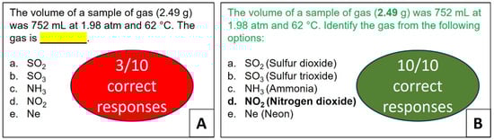 While fill-in-the-blank prompts are common in higher education assessment, administering such prompts to large language models (LLMs) like ChatGPT-3.5, particularly in STEM fields, can generate erroneous responses. Unlike students, who generally stay within the boundaries of topic and context, ChatGPT-3.5 deviates from the standard boundaries set by human norms and mores when filling in missing information. While ChatGPT-3.5 generates responses demonstrating large variations, users may find them confusing, potentially leading to a misunderstanding of essential concepts and hindering the learning process. To prevent ChatGPT-3.5 from providing false or misleading information, replacing open-ended formats like fill-in-the-blank prompts with more direct alternatives is desirable. This was evident in a fill-in-the-blank question where ChatGPT-3.5 had to identify a gas from multiple choices based on mass, volume, pressure, and temperature (see Figure 5 and Table S9 in Supplementary Materials). Specifically, ChatGPT-3.5 was required to calculate moles using the ideal gas equation, determine the molar mass of the unknown gas, compute the molar masses of all the gases provided in the choices, and match the unknown gas to the provided options for identification. This question, aligned with the “apply” level in Bloom’s taxonomy, exhibited an accuracy of three correct responses over ten trials when presented in its unmodified form: “The volume of a sample of gas (2.49 g) was 752 mL at 1.98 atm and 62 °C. The gas is ________.” Interestingly, the responses suggested that the incorrect answers were likely the result of guesswork rather than robust reasoning processes. Additionally, the multiple choices only included the formulas instead of listing both formulas and their names (Figure 5).