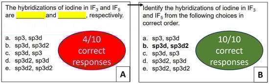 Switching from a fill-in-the-blank format to a prompt structured as “The volume of a sample of gas (2.49 g) was 752 mL at 1.98 atm and 62 °C. Identify the gas from the following options:” and listing the formulas and corresponding names of the gases, enhanced ChatGPT-3.5’s accuracy to correct responses across all ten iterations (see Figure S3 and Table S10 in Supplementary Materials). In addition, ChatGPT-3.5 successfully identified various gases from the same choices when parameters such as temperatures, weights, and pressures were modified (see Figure S3 and Table S10 in Supplementary Materials). To further examine this approach, we selected another “apply”-level prompt from Bloom’s taxonomy, which contained two fill-in-the-blanks and was structured as “The hybridizations of iodine in IF3 and IF5 are ________ and ________, respectively” (see Figure 6 and Table S11 in Supplementary Materials). The unmodified prompt yielded four correct answers over ten trials, whereas with the format of a direct question, the accuracy increased to 100% over ten trials (see Figure S4 and Table S12 in Supplementary Materials). Furthermore, ChatGPT-3.5 continued to provide correct responses with the modified prompt even when choices were altered (see Figure S4 in Supplementary Materials). Notably, the revised prompt also proved effective for identifying the hybridization of other classes of compounds, such as hydrocarbons (see Figure S4 in Supplementary Materials) and both high- and low-spin iron (III) and Co(III) complexes (see Table S12 in Supplementary Materials).