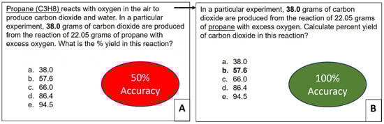 While background information is crucial for accurate responses from ChatGPT-3.5 in complex prompts, overindulging or misplacing it can lead to inaccurate responses. Finding the balance between sufficient context and concise framing is critical to unlocking the full potential of ChatGPT-3.5 [43,44,45]. For instance, in a general chemistry exam, simply removing the introductory context from the propane combustion prompt, which is categorized as an “apply”-level question in Bloom’s taxonomy, and focusing directly on the specific data led to a notable improvement in ChatGPT-3.5’s accuracy, increasing it from 50% to 100% (see Figure 7 and Tables S13 and S14 in Supplementary Materials). The revised prompt exhibited remarkable generalizability, accurately predicting the target percent yields across a spectrum of scenarios, from different weights of CO2 (see Figure S5 and Table S14 in Supplementary Materials), with different combinations of weights of CO2 and propane (see Figure S5 in Supplementary Materials), and even in the combustion of octane with varying numerical weights for both CO2 and octane (see Figure S5 in Supplementary Materials). While both prompts involve a chemical reaction between propane and oxygen, their approach differs. Prompt 1 immediately delves into a specific experiment, detailing precise quantities of reactants (38.0 g of carbon dioxide, 22.05 g of propane, and excess oxygen), clearly emphasizing calculating the percentage yield for this unique scenario.