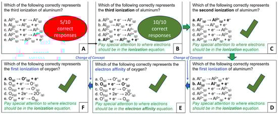 Influence of specialized cues on ChatGPT-3.5 output. (A) Five correct responses over ten attempts on unmodified questions. (B) Ten correct responses in ten attempts on modified questions. (C,D) depict the effectiveness of the revised prompt on aluminum’s second and first ionization energies, respectively. (E) represents a conceptual shift in investigating the electron affinity of oxygen using the revised prompt. (F) highlights a conceptual shift, transitioning from electron affinity to the first ionization energy of oxygen, with the choices maintained as in (E).