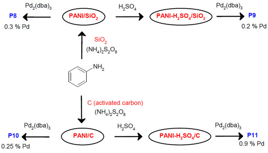 Figure 4. Schematic synthesis of samples P8–P11, which contain PANI and additional carriers. Carriers are marked by red, while Pd-containing composites are marked by blue. Contents of Pd determined by AAS are shown for convenience. - -