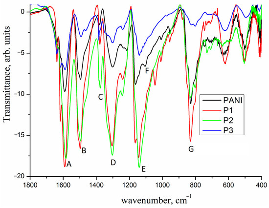 IR spectra of PANI and P1–P3 (the composites, formed upon the in situ polymerization of aniline or PANI treatment with aqueous solutions).