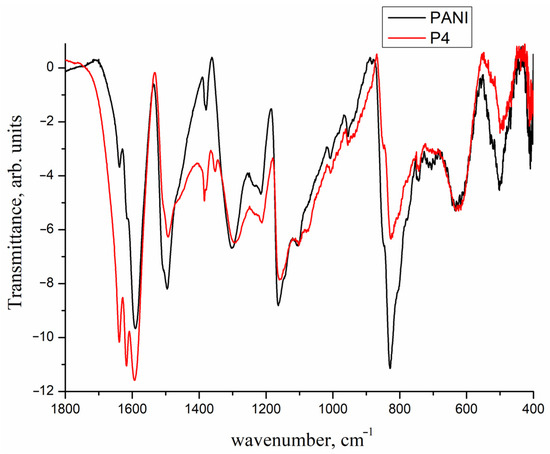 IR spectra of PANI and P4 (the composite, formed upon Pd deposition on PANI via the decomposition of Pd2(dba)3).