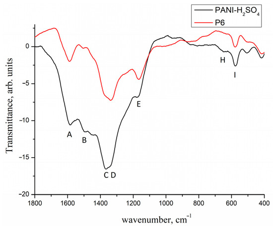 IR spectra of PANI-H2SO4 and P6 (the composite, formed upon Pd deposition on PANI-H2SO4 via the decomposition of Pd2(dba)3).