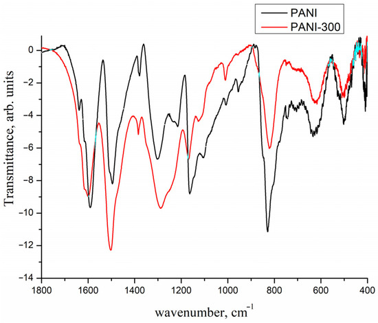 Thermal treatment of PANI in H2 atmosphere at 300 °C did not cause significant changes of the IR spectrum (Figure 8). The positions of the main bands were the same or very similar, implying that the structure of the “building blocks” (oligomeric fragments) of PANI did not change. Thus, heating to 300 °C did not cause carbonization of the polymer, but this observation does not exclude cross-linking of the 1D polymeric chains.